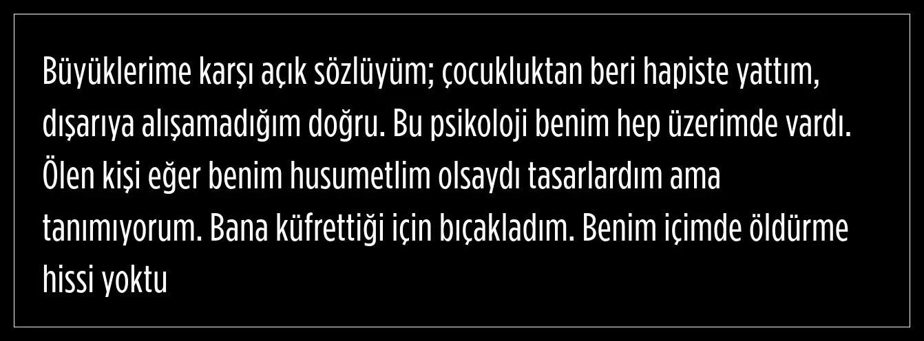 Ankara’da geçen yıl Mayıs ayında, tanımadığı Yetkin Güner’i (45) sokak ortasında bıçaklayarak öldüren İsmail Tek (29), mahkemede verdiği ifadeyle kan dondurdu. Küçük yaşlardan itibaren cezaevinde olduğunu belirten sanık, dışarıya alışamadığını ve psikolojik sorunlar yaşadığını söyledi.