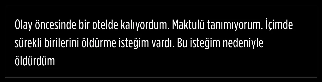 Ankara'da sokak ortasında tanımadığı bir kişiyi öldüren sanık, ''Öldürme isteğim vardı öldürdüm. Çocukluktan beri hapiste yattım. Dışarıya alışamadım'' dedi.