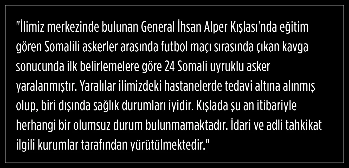 Isparta'da General İhsan Alper Kışlası’nda eğitim gören Somalili askerler arasında oynanan futbol maçı sırasında kavga çıktı. Olayda ilk belirlemelere göre 24 asker yaralandı.