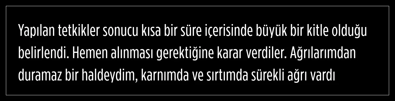 Karnındaki şişliği kilo alma şeklinde düşündüğünü aktaran Semra Akgeyik, ilk başlarda ağrısının olmadığını, daha sonralarda ağrısının artması ve şişlik oluşmasıyla birlikte hastaneye başvurduğunu ifade etti.