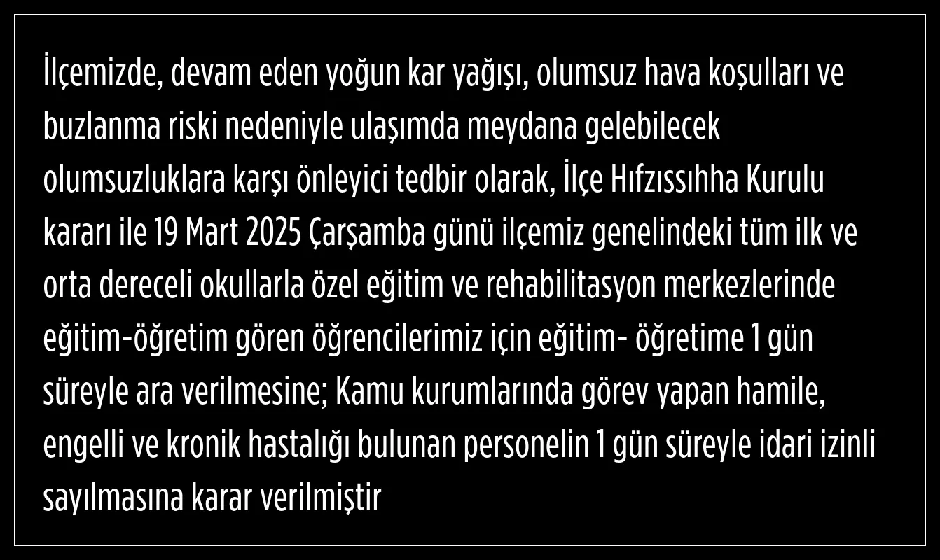 Konya Valiliğinden konuya ilişkin açıklama yapıldı. Açıklamada, ilçede devam eden yoğun kar yağışı, olumsuz hava koşulları ve buzlanma riski nedeniyle ulaşımda oluşabilecek olumsuzluklara karşı önleyici tedbir olarak eğitime bir gün ara verildiği açıklandı.