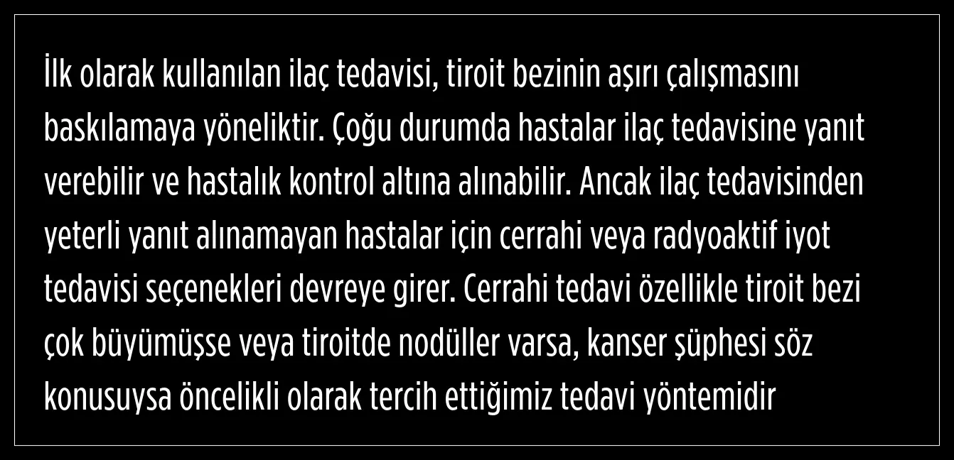 Tiroit bezinin büyüklüğünde, kanser şüphesinde veya hastada nefes almakta zorlanma gibi semptomlar olması durumunda cerrahi tedaviye başvurulabileceğini belirten Genel Cerrahi Uzmanı Doç. Dr. Hüsnü Aydın, ayrıca tiroit hastalığına bağlı olarak hızlı bir şekilde tedavi edilmesi gereken hastalar için cerrahi yöntemin önerilmesi gerektiğini aktardı. Aydın, ayrıca hastalarda yakın zamanda bir gebelik planı varsa ya da tiroit bezinde oluşan nodüller nefes borusuna ya da yemek borusuna baskı yapıyorsa bu durumda da cerrahi tedavinin öncelikli olduğunu ifade etti.