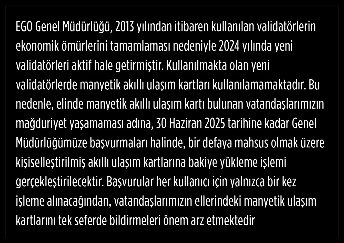 Açıklamada, elinde manyetik ulaşım kartı bulunan vatandaşların mağduriyet yaşamaması adına, 30 Haziran 2025 tarihine kadar Genel Müdürlüğüne başvurmaları gerektiği ve bir defaya mahsus olmak üzere kişiselleştirilmiş akıllı ulaşım kartlarına bakiye yükleme işlemi gerçekleştirileceği belirtildi.