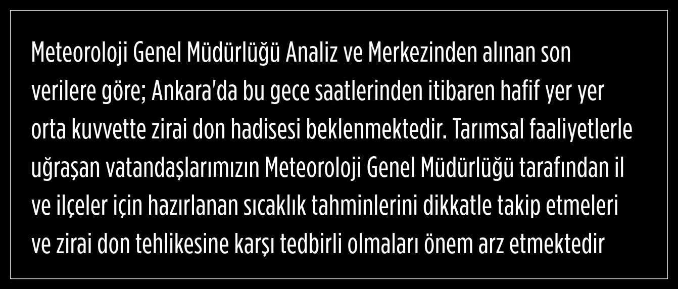Ankara Valiliği, gece saatlerinden itibaren zirai don hadisesinin beklendiğini duyurdu. Valilik, vatandaşlara dikkatli ve tedbirli olun çağrısı yaptı.