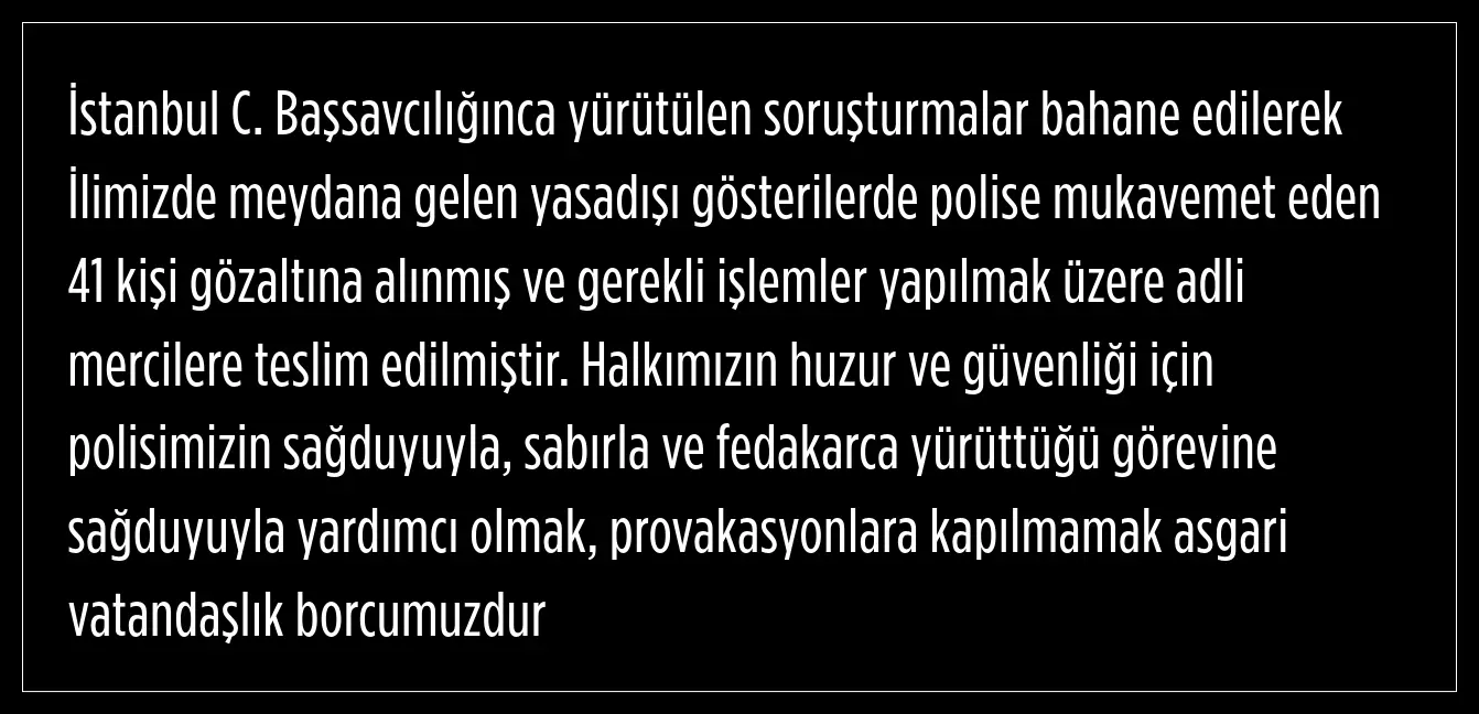 Vasip Şahin, İstanbul C. Başsavcılığınca yürütülen soruşturmaların bahane edilerek, kentte meydana gelen yasadışı gösterilerde polise mukavemet eden 41 kişinin gözaltına alındığını duyurdu. Şahin, gerekli işlemlerin yapılmak üzere adli mercilere teslim edildiği ifade edildi.