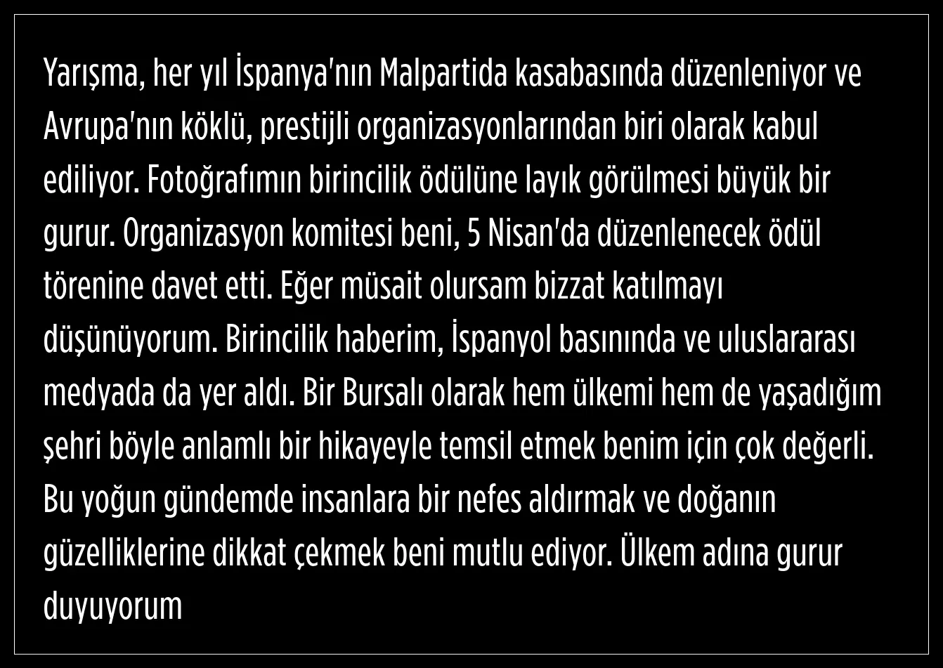 Fotoğrafını ödüle layık görülmesinin büyük bir gurur olduğunu ifade eden Alper Tüydeş, hem ülkesini hem de yaşadığı Bursa şehrini anlamlı bir hikayeyle temsil etmenin çok değerli olduğunu belirtti.