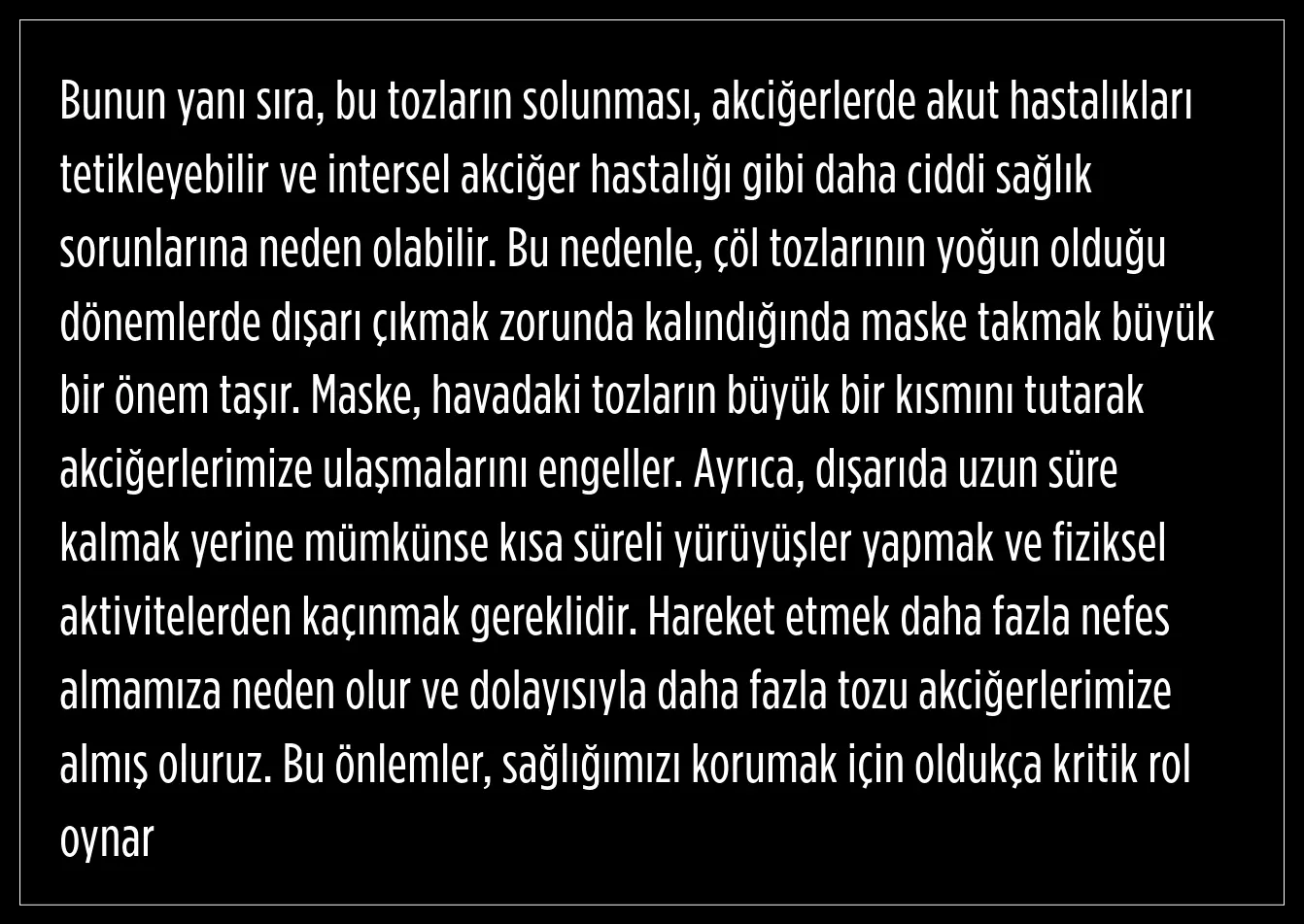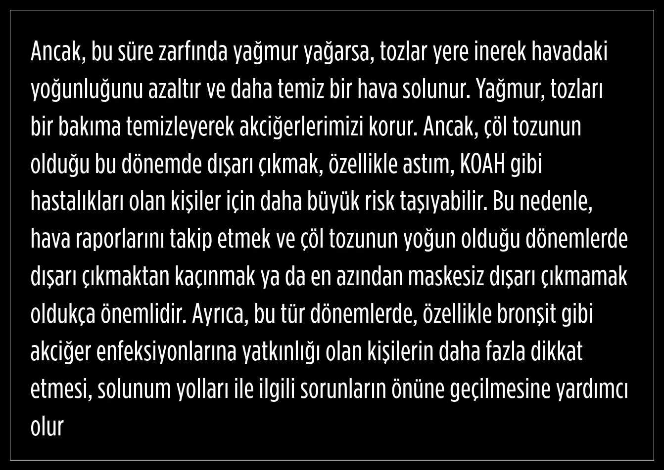 Çöl tozlarının ne kadar süreceğinin coğrafi hareketlilik ve hava koşulları ile doğrudan ilişkili olduğunu belirten Göğüs Hastalıkları Uzmanı Prof. Dr. Muhammed Emin Akkoyunlu, bu tozların genellikle 3-5 gün süren bir süre zarfında hava kirliliği oluşturduğunu aktardı. Akkoyunlu, şöyle devam etti: