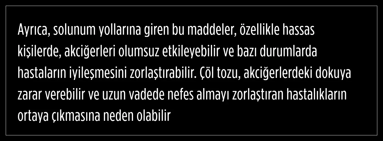 Çöl tozlarının tarım için bereketli olduğunu ancak insan sağlığını olumsuz yönde etkilediğini ifade eden Prof. Dr. Akkoyunlu, çöl tozlarının organik ve inorganik maddeleri taşıdığı için akciğerlerde birikerek enfeksiyonlara ve alerjik reaksiyonlara yol açtığını belirtti.