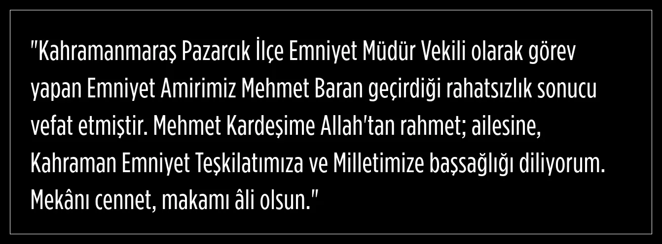 İçişleri Bakanı Ali Yerlikaya, Kahramanmaraş'ın Pazarcık ilçesinde görev yapan Emniyet Amiri Mehmet Baran’ın geçirdiği rahatsızlık sonucu vefat ettiğini duyurdu.