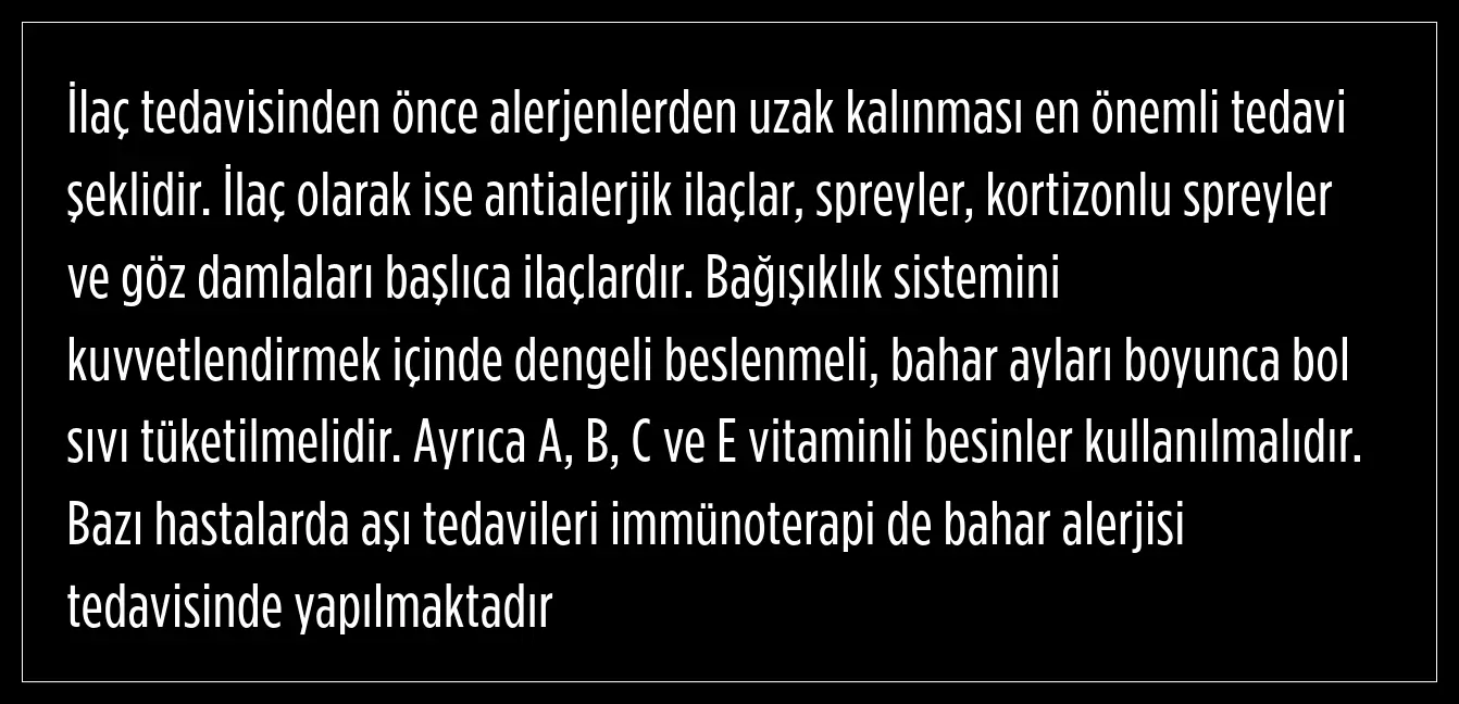 Bahar alerjisinin kronik bir hastalık olduğunu ifade eden Öztürk, ilaç tedavisinden önce alerjenlerden uzak kalınmasının en önemli tedavi şekli olduğunu aktardı.