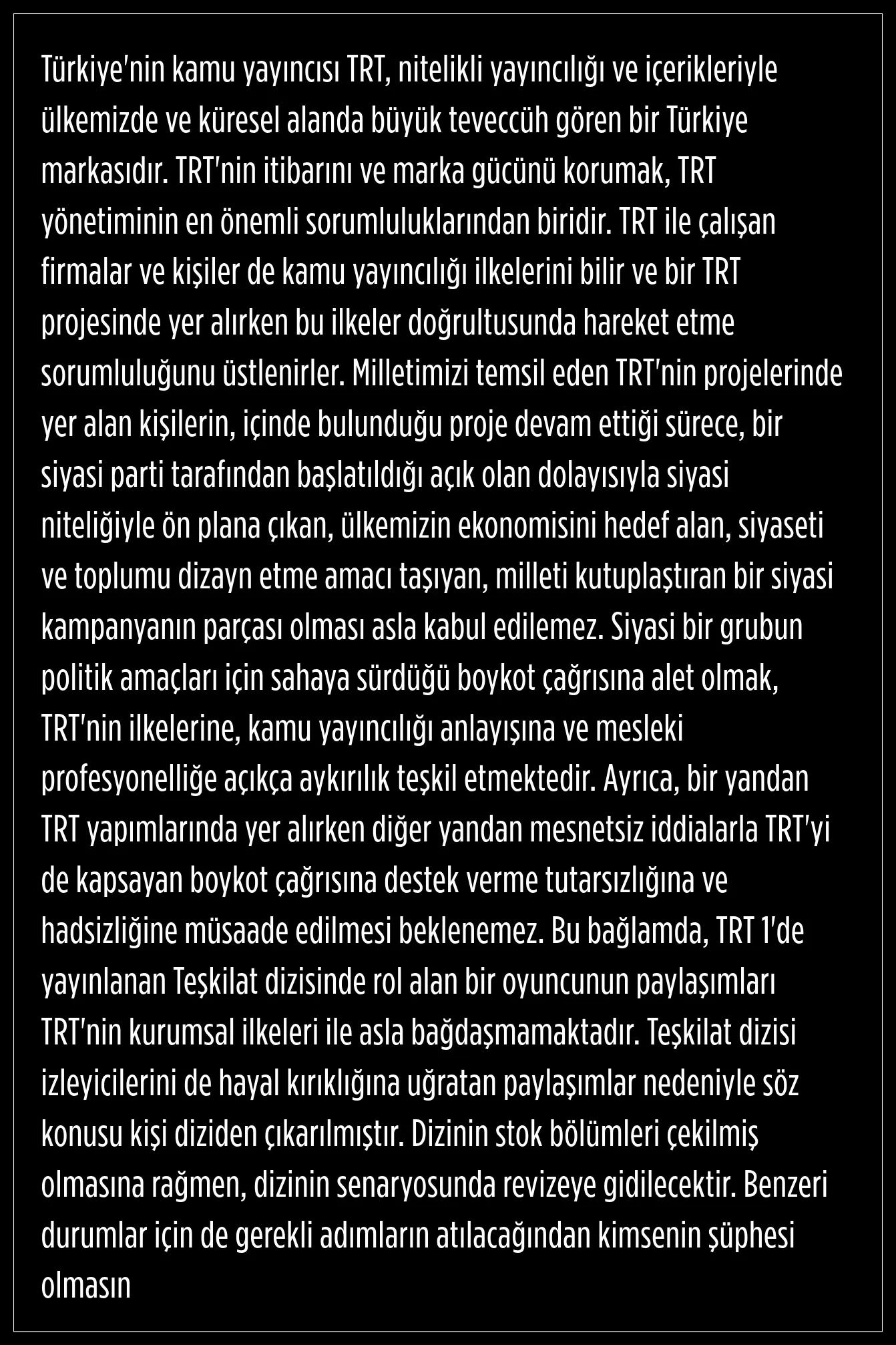 "TRT’nin kurumsal ilkeleri ile asla bağdaşmamaktadır. diziden çıkarılmıştır”