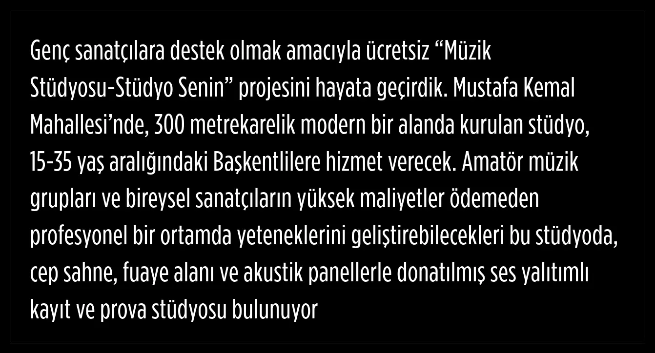 Ankara Büyükşehir Belediyesi, genç sanatçılara destek olmaya amacıyla “Müzik Stüdyosu-Stüdyo Senin” projesini hayata geçirdi. Bu projenin tamamen ücretsiz olacağı duyuruldu.