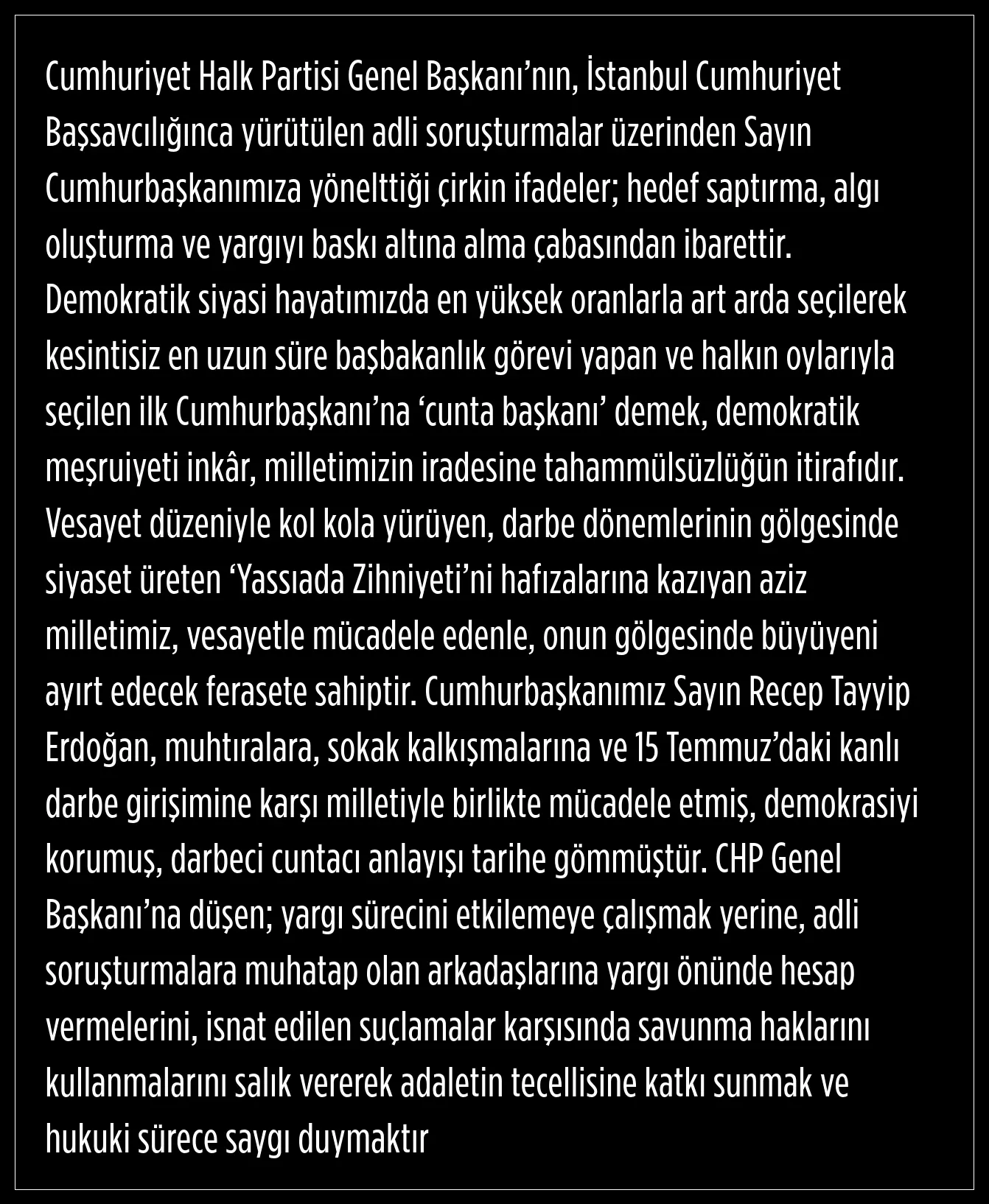 Tunç, Özgür Özel'in Cumhurbaşkanına yönelttiği çirkin ifadelerin; hedef saptırma, algı oluşturma ve yargıyı baskı altına alma çabasından ibaret olduğunu ifade etti.