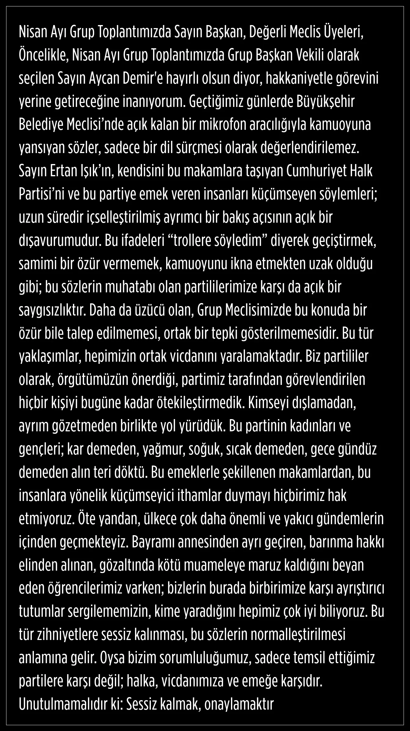 Açıklamada, Ertan Işık'ın sözlerinin sadece bir dil sürçmesi olarak değerlendirilemeyeceği ifade edildi. Yapılan açıklamada, "Sayın Ertan Işık’ın, kendisini bu makamlara taşıyan Cumhuriyet Halk Partisi’ni ve bu partiye emek veren insanları küçümseyen söylemleri uzun süredir içselleştirilmiş ayrımcı bir bakış açısının açık bir dışavurumudur" ifadeleri yer aldı.
