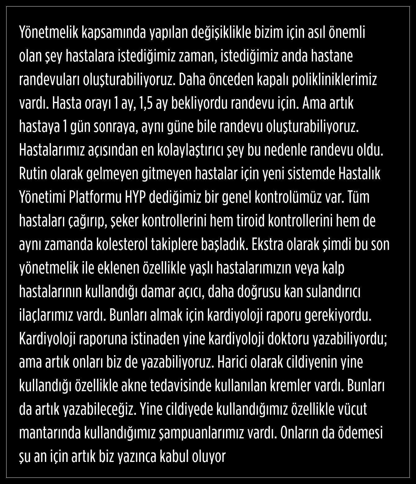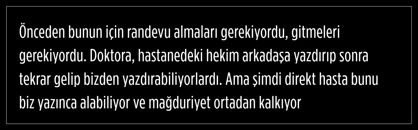 Artık hastaların kendilerine en yakın aile hekimlerine giderek orada tüm ilaçları yazdırıp alabileceklerini ifade eden aile kekimi, şunları söyledi: