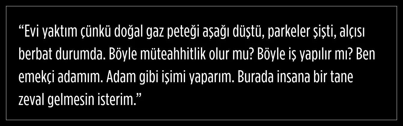 Yangını kendisinin çıkardığını açıkça ifade eden Hüseyin Durmaz, müteahhide olan tepkisini şu sözlerle dile getirdi: