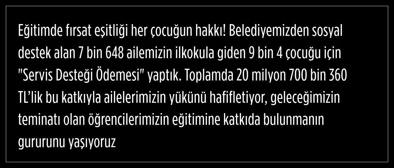 Yapılan açıklamada, belediyeden sosyal destek alan 7 bin 648 ailenin ilkokula giden 9 bin 4 çocuğu için "Servis Desteği Ödemesi" yapıldığı ifade edildi.