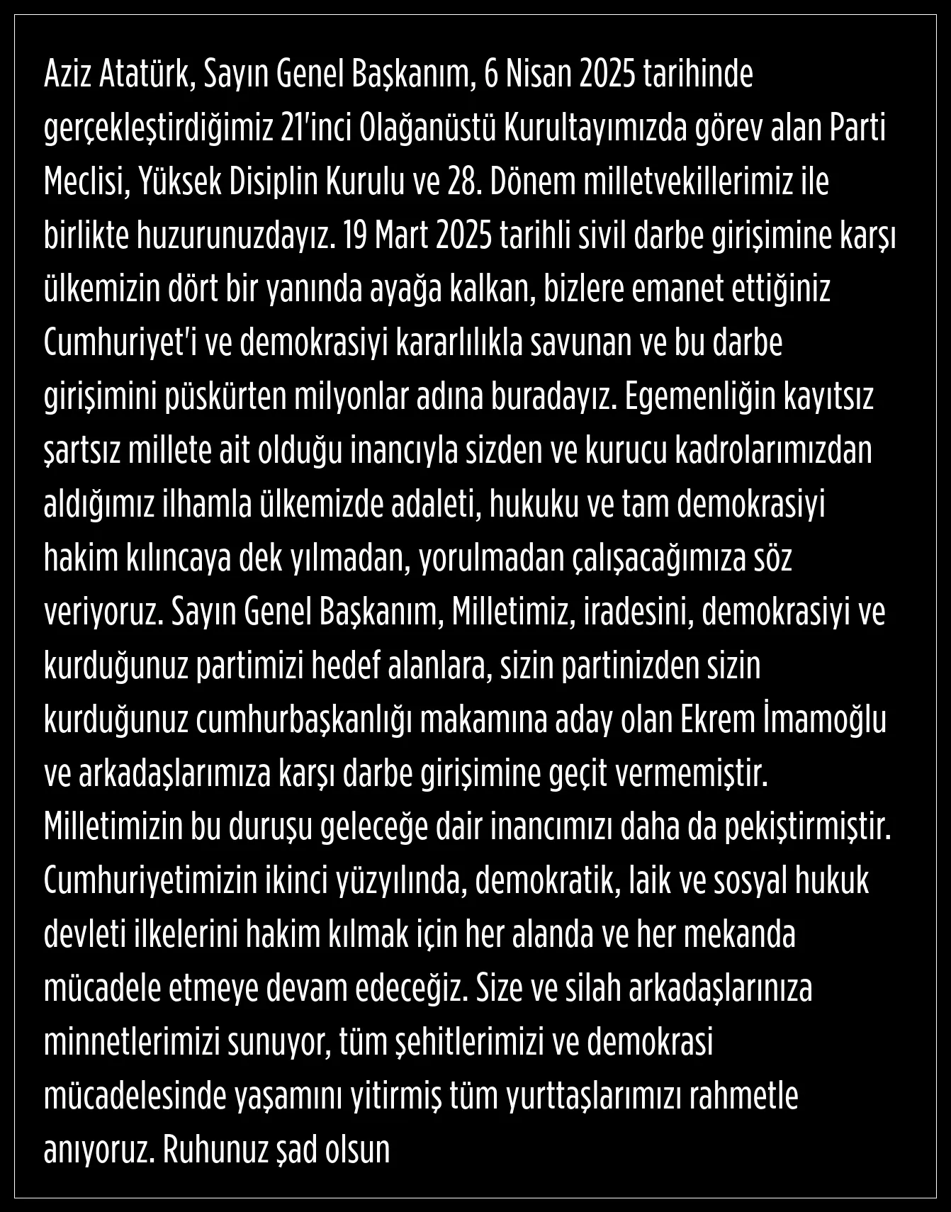 Cumhuriyet Halk Partisi'nin 21. Olağanüstü Kurultayı, 6 Nisan Pazar Günü Ankara’da “İrade Milletindir” sloganıyla yapıldı. Yenimahalle Nazım Hikmet Kültür Merkezi’nde gerçekleştirilen kurultayda tek aday olan Özgür Özel, yeniden CHP Genel Başkan seçildi. Özgür Özel, 1.171 oy aldı.