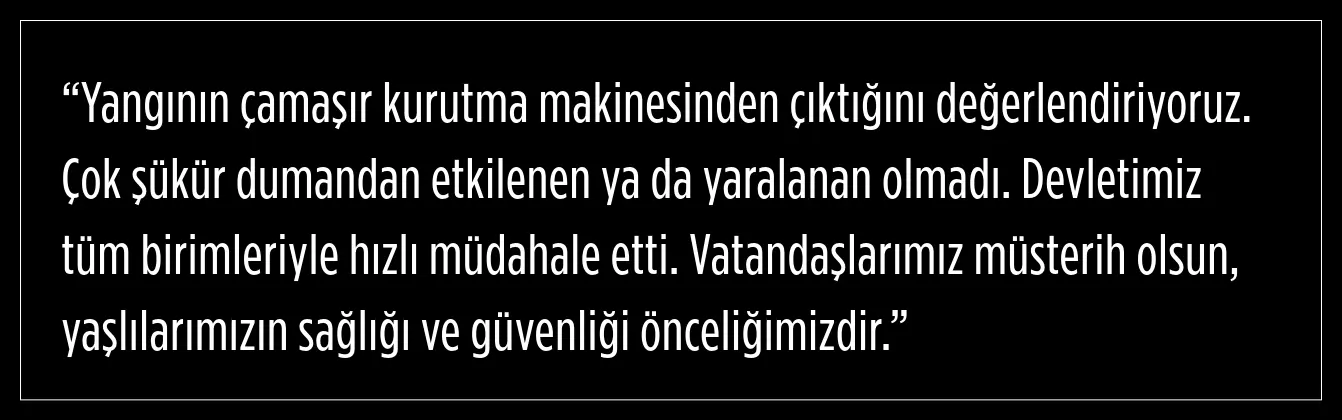 Yangının ihbar edilmesiyle birlikte olay yerine itfaiye ve sağlık ekipleri sevk edildi. Ekiplerin hızlı müdahalesi sonucu yangın yaklaşık 1 saatte kontrol altına alındı. Binaya yayılan duman nedeniyle yaşlıların etkilenmemesi için hızlı tahliye kararı alındı.
