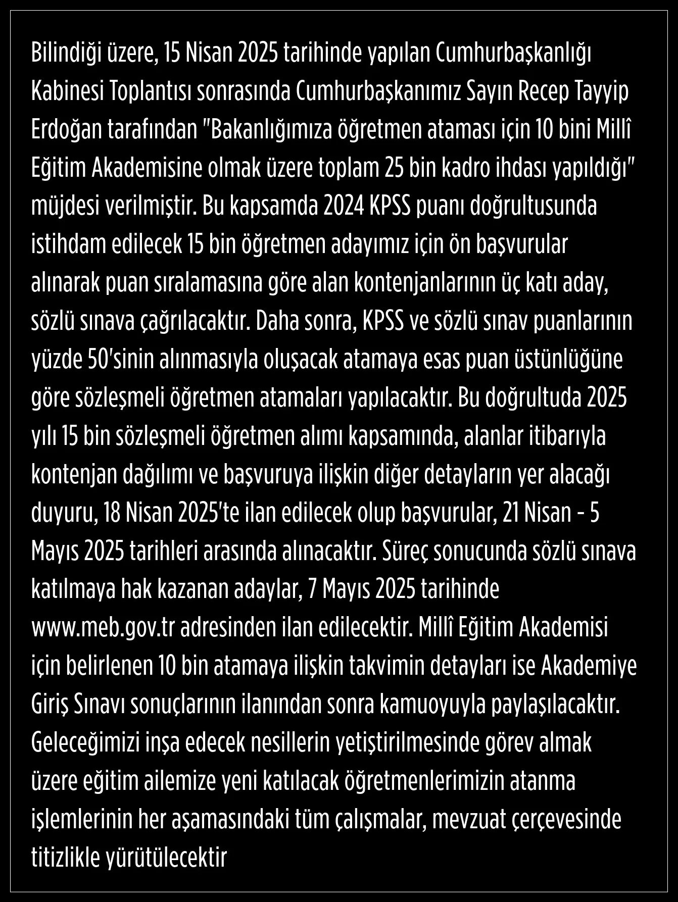 Her yıl heyecanla beklenen sözleşmeli öğretmen atamalarıyla ilgili 2025 yılına dair belirsizlik sona erdi. Öğretmen adaylarını sevindirecek haberi Cumhurbaşkanı Recep Tayyip Erdoğan, kabine toplantısının ardından yaptığı açıklamayla duyurdu.