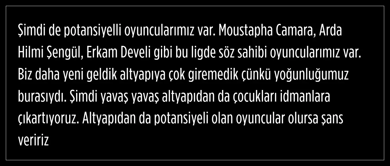 Takımın teknik direktörü Sedat Ağçay, bu kulübün olanaklarının bakımından futbolculara ve teknik heyete her şeyi sunduğunu ifade ederek, şöyle devam etti: