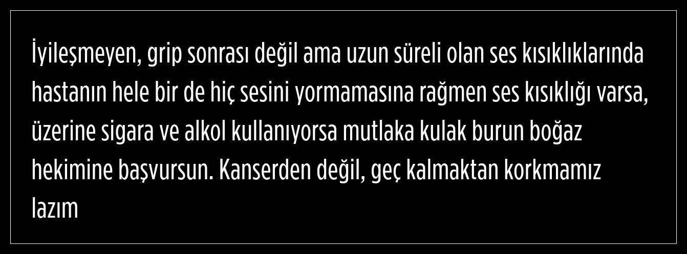 Gırtlak kanserinin ilk bulgusunun ses kısıklığı olabileceğini söyleyen Doç. Dr. Çobanoğlu, uzun süren ses kısıklıklarından sonra hastaneye başvurulması gerektiğini söyledi.