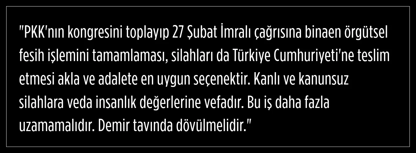 Bahçeli, PKK'nın örgütsel olarak feshedilmesi gerektiğini ifade etti. 27 Şubat İmralı çağrısının dikkate alınarak, silahların Türkiye Cumhuriyeti'ne teslim edilmesini uygun bir seçenek olarak değerlendiren Bahçeli, şu ifadeleri kullandı: