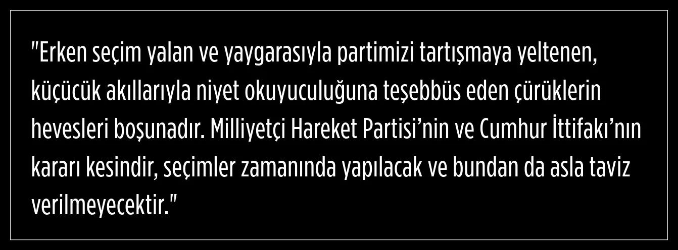 Bahçeli, MHP'nin (Milliyetçi Hareket Partisi) ve Cumhur İttifakı'nın "seçimlerin zamanında yapılması" konusundaki kararlılığını yineledi. Erken seçim söylemlerinin gerçek dışı olduğunu şu sözlerle vurguladı: