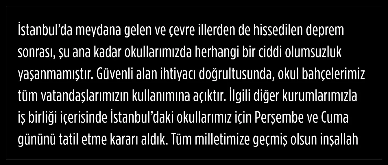 Bakan Tekin, sosyal medya hesabı üzerinden yaptığı açıklamada, İstanbul’da meydana gelen ve çevre illerden de hissedilen deprem sonrasında şu ana kadar okullarda herhangi bir ciddi olumsuzluk yaşanmadığını ifade etti.