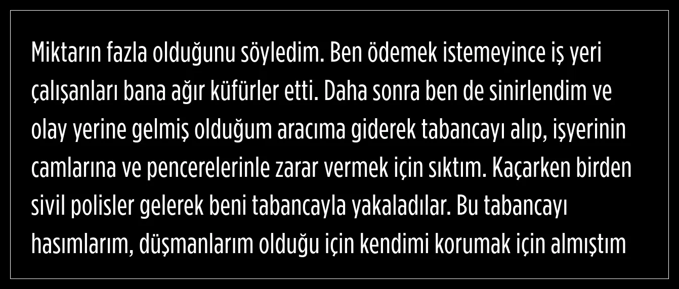 Şüpheli Ali C.’nin ifadesinde, gece kulübüne eğlenmek amaçlı gittiğini, mekanda bir miktar alkol aldığını ifade ederek, mekandan çıktığı sırada 5 bin liralık hesabı 25 bin lira olarak istediklerini ve vermediğini belirtti. Şüpheli, şu ifadeleri kullandı: