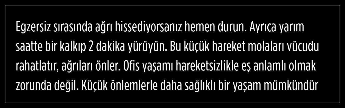 frm(Telefonu boyun ile omuz arasında sıkıştırmaktan kaçının. Çayınızı kendiniz alın, aracınızı birkaç sokak öteye park edin. Böyle küçük dokunuşlarla hareketsizliği azaltmak mümkün. Ayrıca klima ve havalandırmanın doğrudan vücuda temas etmemesine dikkat edilmeli çünkü bu da kas ağrılarını artırabiliyor)