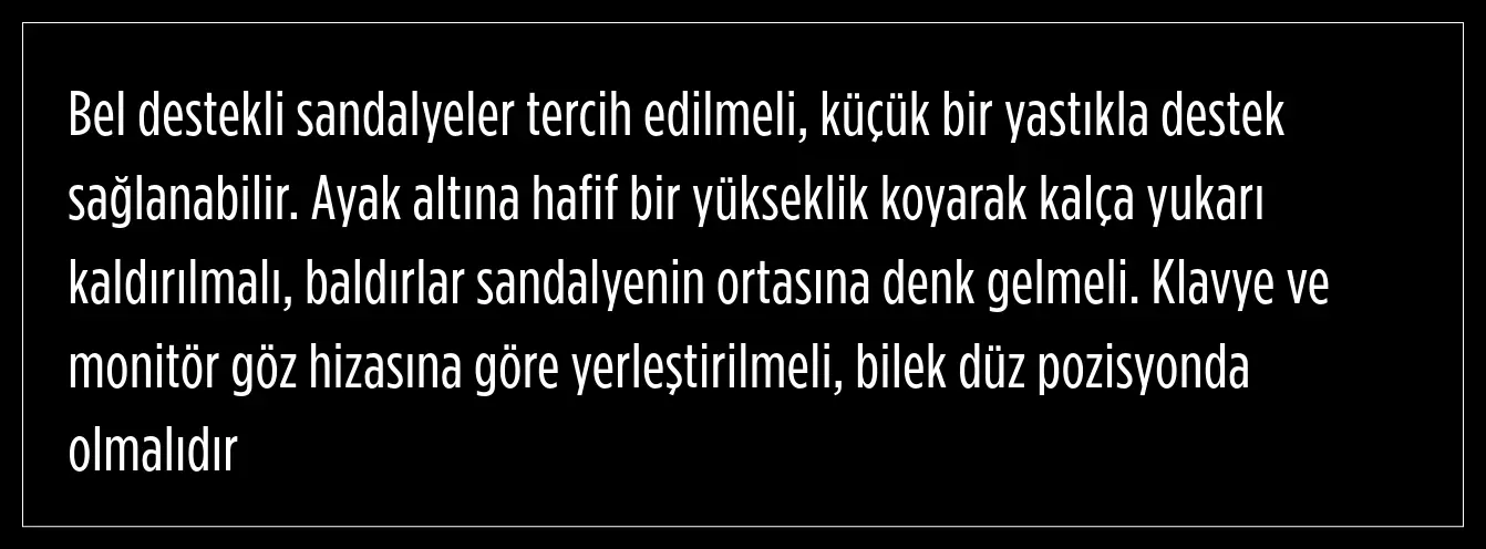 Ofis çalışanları için oturma düzeninin büyük önem taşıdığını vurgulayan Fiziksel Tıp ve Rehabilitasyon Uzmanı Doç. Dr. Mehmet Ağırman, başın monitör ekranına bakarken dik durması gerektiğini belirtti. omuzların rahat ve sırtın dik olması gerektiğine dikkat çeken Ağırman, şöyle devam etti:
