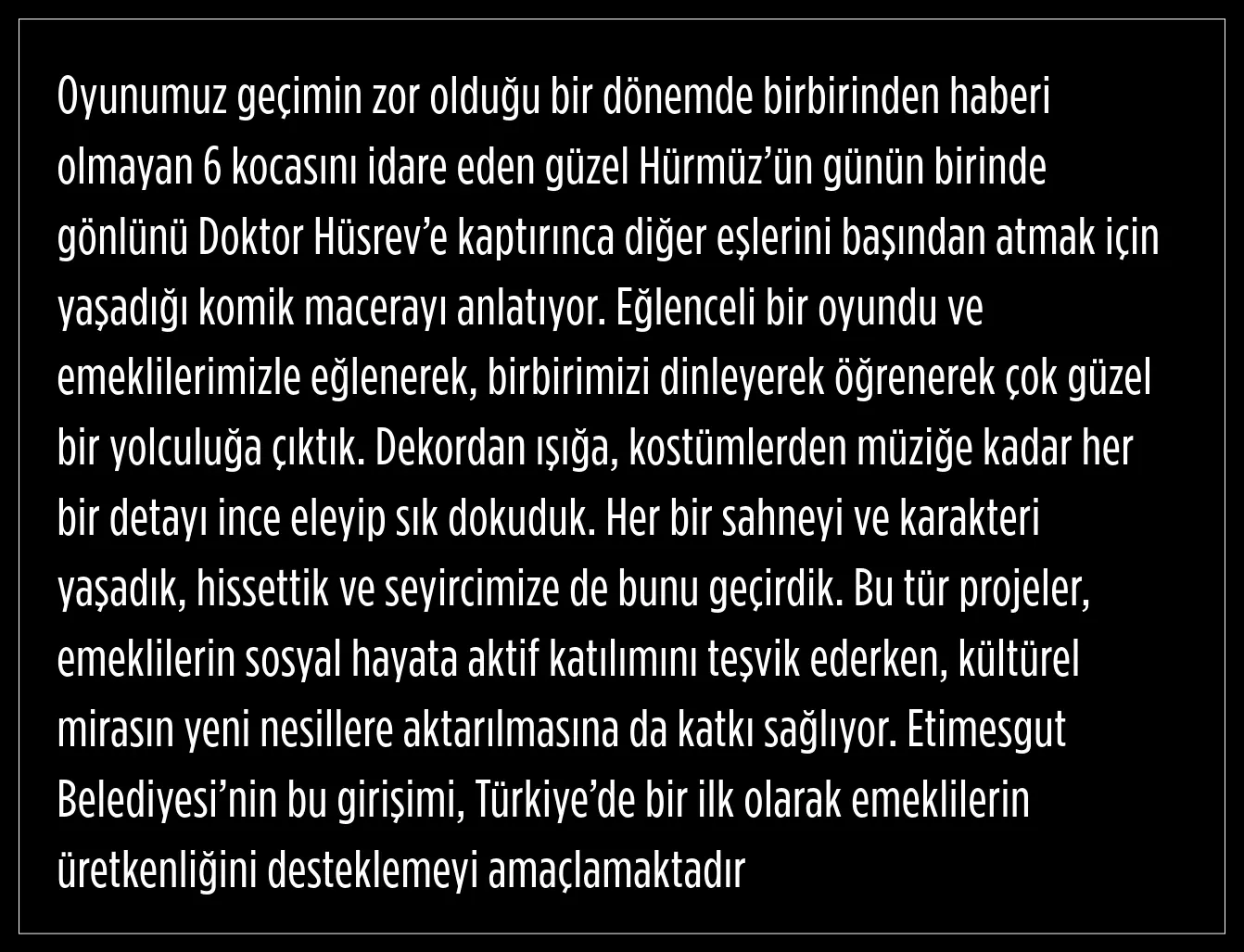 Etimesgut Belediyesi bünyesinde faaliyet gösteren Emekliler Tiyatrosu, Sadık Şendil’in klasik eseri Yedi Kocalı Hürmüz’ü sahneledi. Gösterim, Korkut Ata Kongre ve Kültür Merkezi'nde gerçekleştirildi.