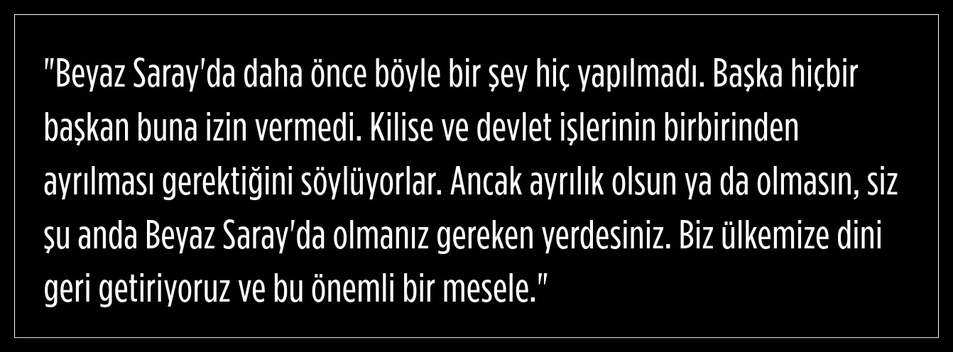 Geçmişte devlet ve kilise işlerinin ayrılığına dikkat çekilmesine rağmen dini temsilcilerin Beyaz Saray'da yer almasının doğal olduğunu ifade eden Trump, bu yaklaşımın, inanç özgürlüğünü daha etkin kılmak adına atılmış bir adım olduğunu belirtti. Trump'ın konuya dair açıklamaları şu şekilde: