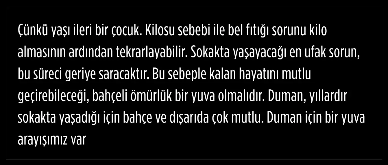 Duman’ın kilo vermesiyle birlikte bel fıtığı kaynaklı şikâyetleri de büyük ölçüde azaldı. Hem fiziksel hem de genel sağlık durumu büyük ölçüde düzelen Duman, şimdi kalıcı bir yuva arıyor. Hayatında ikinci bir şansı yakalayan bu sevimli dost, yeni sahiplerini bekliyor.