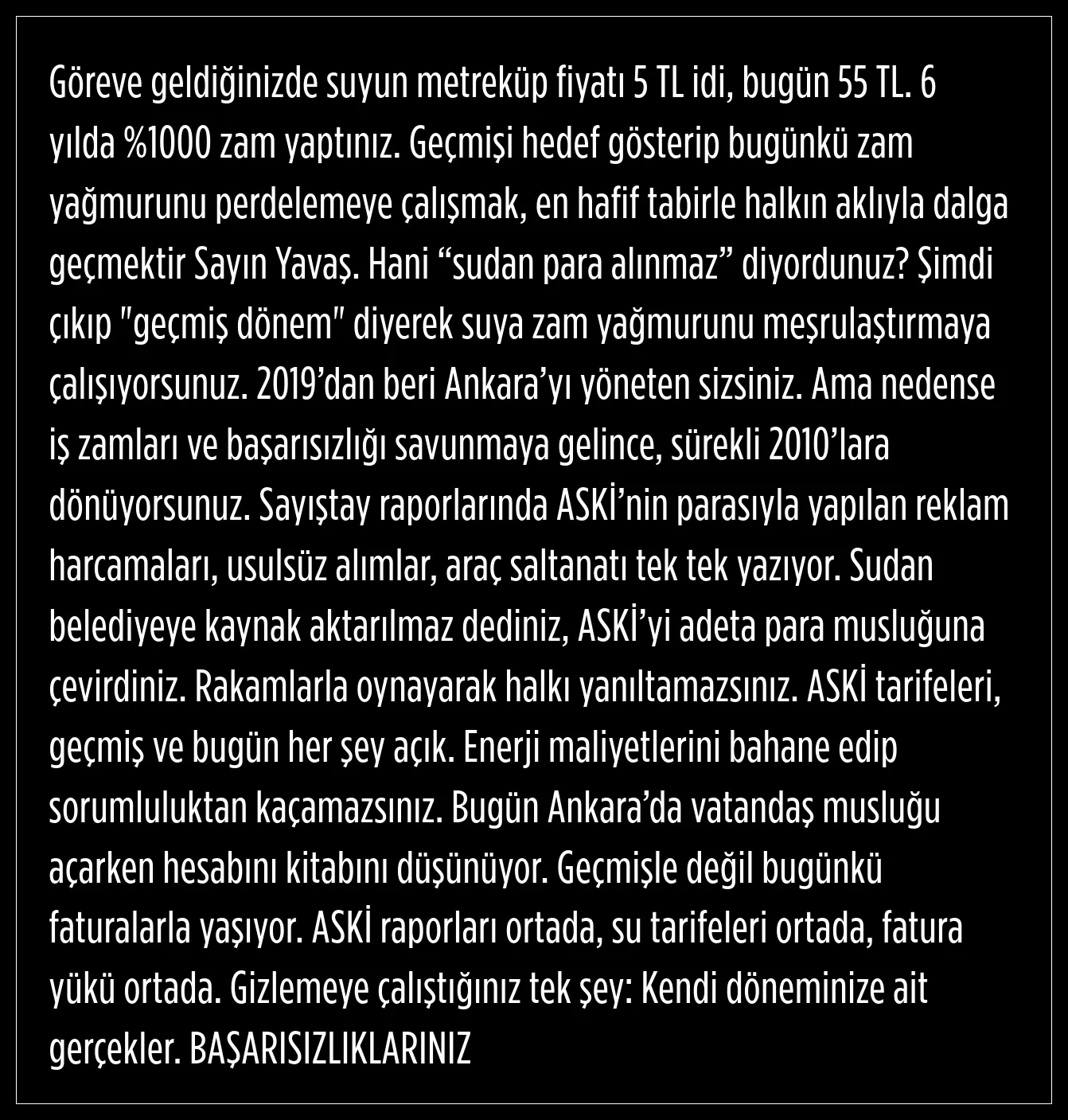 Hakan Han Özcan, Mansur Yavaş'ın göreve geldiğinde suyun metreküp fiyatının 5 TL, bugün ise 55 TL olduğunu söyledi. Özcan, 6 yılda yüzde 1000 zam yapıldığını ifade etti.