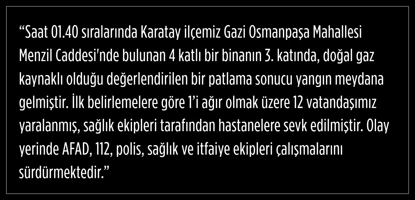 Karatay ilçesinde bir apartmanın üçüncü katında gece saatlerinde meydana gelen patlamada 12 kişi yaralandı. Patlamanın doğal gaz sızıntısından kaynaklandığı düşünülüyor.