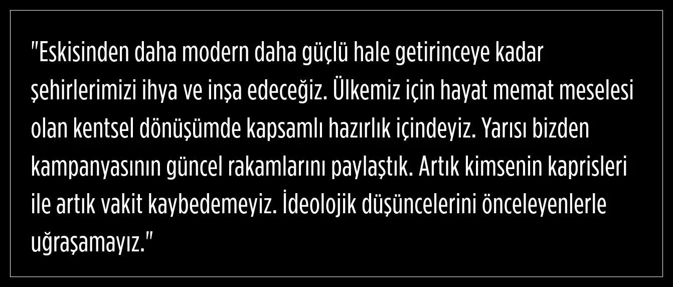 Kentsel dönüşümün Türkiye için hayati önem taşıdığını belirten Erdoğan, bu kapsamda kapsamlı hazırlıklar yürütüldüğünü ve artık zaman kaybına tahammül olmadığını şu sözlerle dile getirdi: