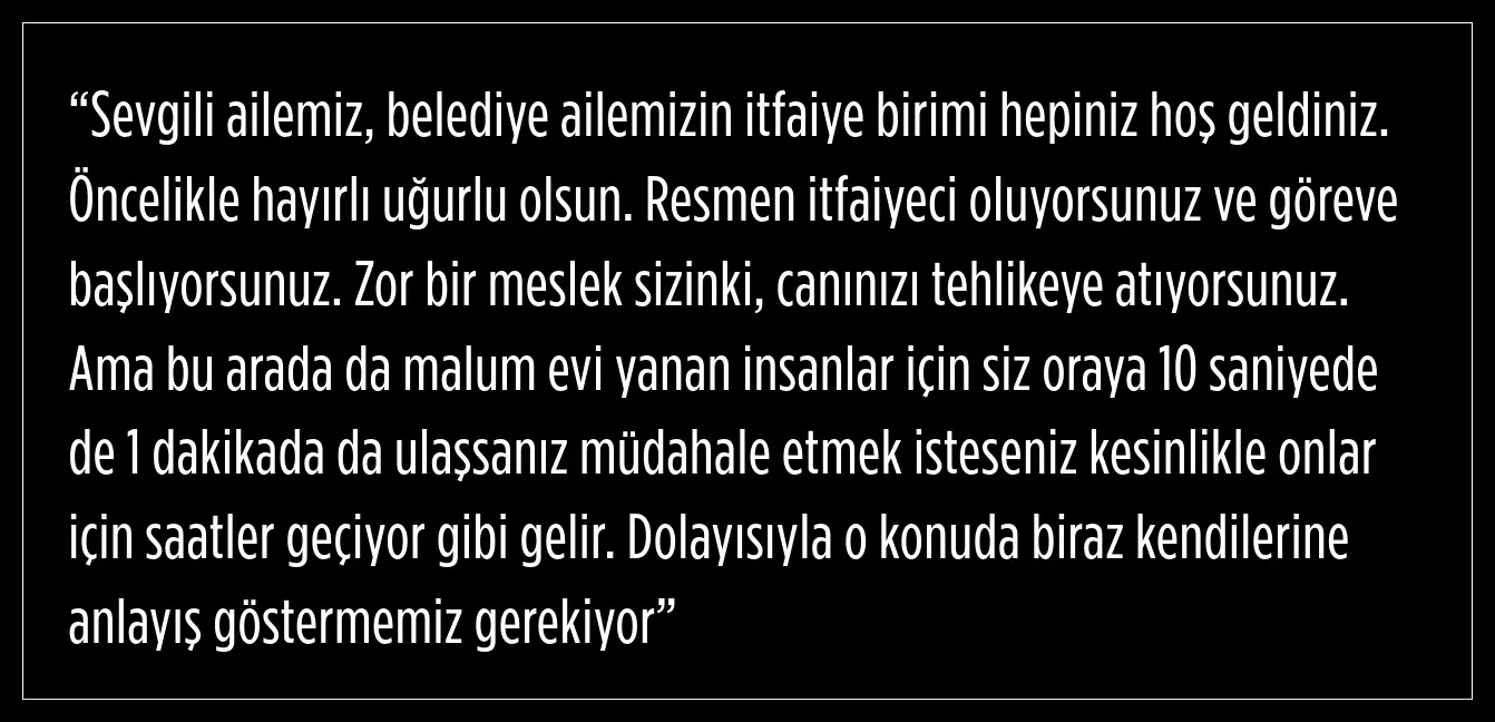 "Canınızı tehlikeye atarak vatandaşlarımızın hayatını kurtaracaksınız. Unutmayın ki kurtardığınız her can, sizi asla unutmayacak. Türkiye'nin en dinamik itfaiye teşkilatı artık sizlersiniz."
