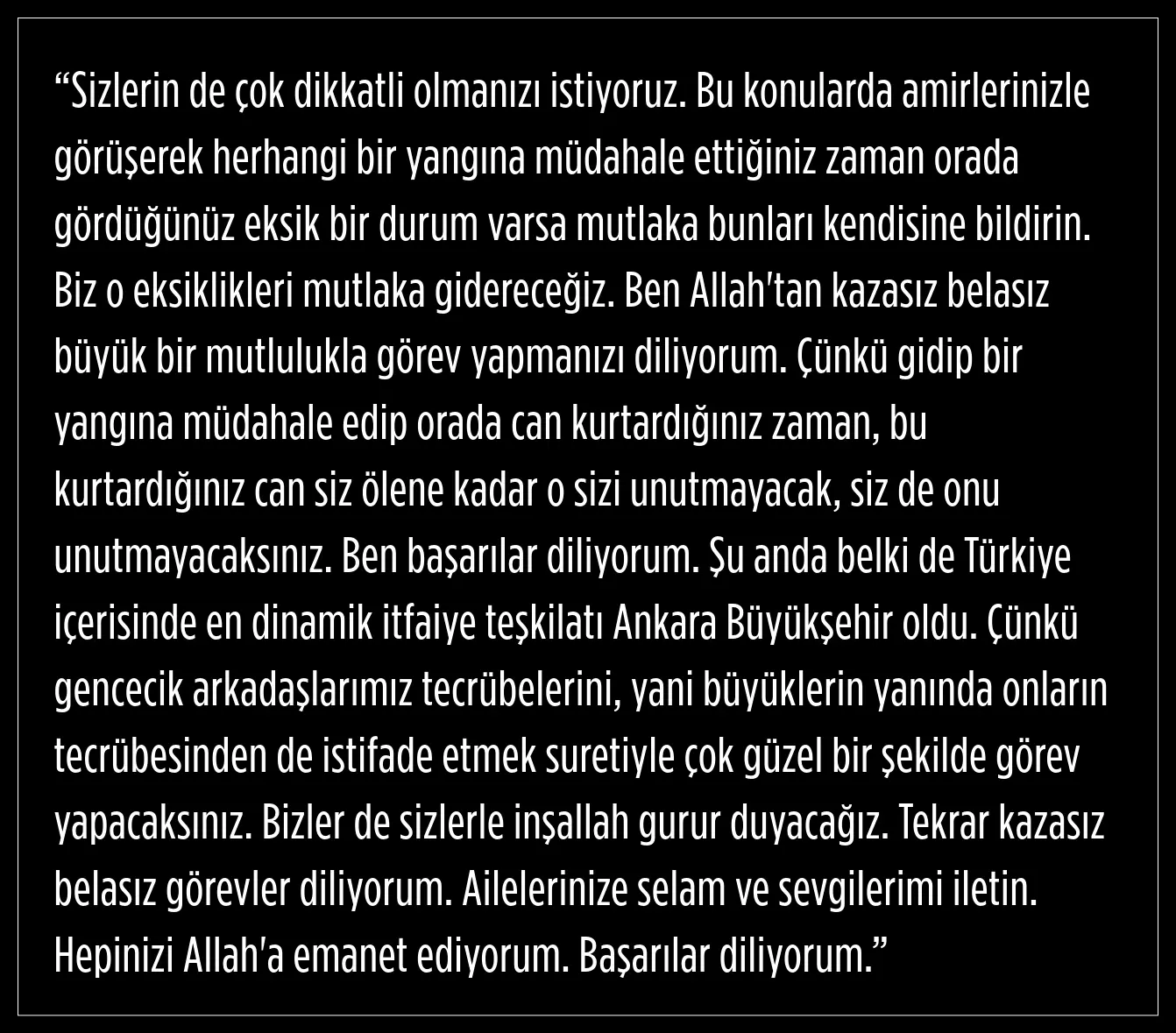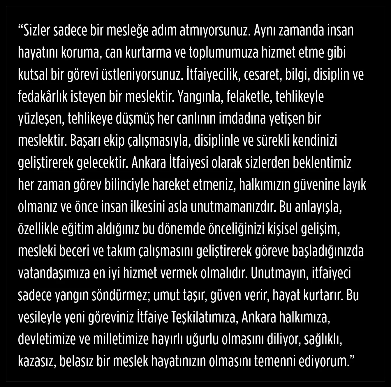 "Bu meslek sadece yangın söndürmek değil, umut taşımaktır. Disiplin, ekip çalışması ve sürekli eğitimle Ankara halkına en iyi hizmeti vereceğinize inanıyorum. Unutmayın, her müdahaleniz bir hayat kurtarmak demek."