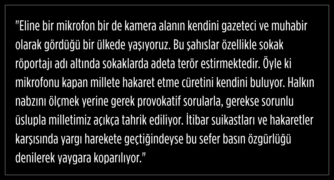 Erdoğan, son dönemde sokak röportajları adı altında yapılan provokasyonlara da tepki gösterdi. Bir mikrofon ve kamera ile sokaklara çıkan kişilerin gazeteci olamayacağını ifade eden Erdoğan, bu tür röportajların halkı tahrik ettiğini şu sözlerle dille getirdi:
