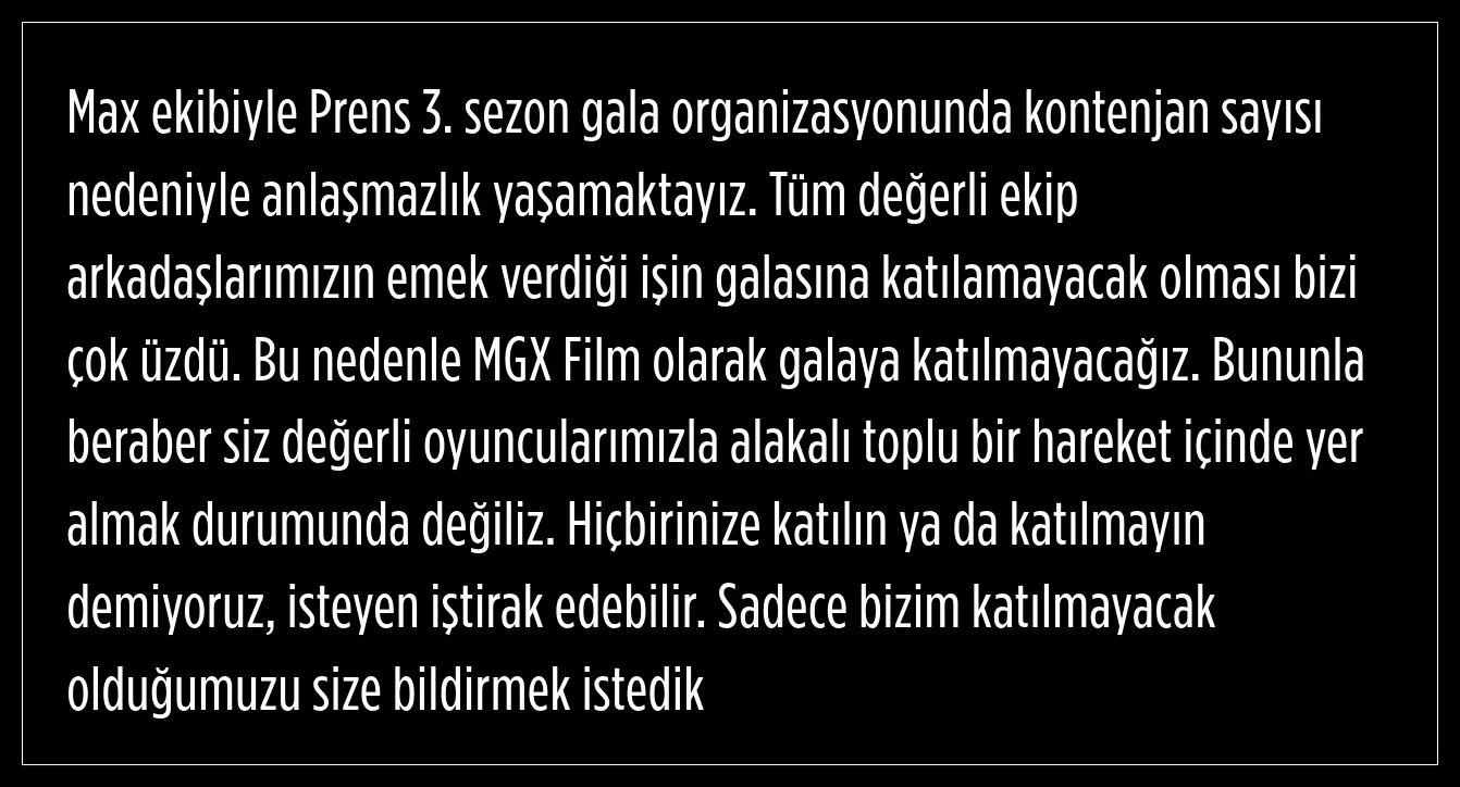 Max’in katılımcı sayısına getirdiği kısıtlama nedeniyle, MGX Yapım “Prens” dizisinin 3. sezon galasına oyuncular ve teknik ekip tam kadro katılamayınca, ekip galaya topluca katılmama kararı aldı. Dizinin başrol oyuncusu Giray Altınok, "Biz diziyi beraber çektiğimiz tüm emekçi arkadaşlarımızı galada görmek isteriz" diyerek ekip arkadaşlarıyla beraber katılmama kararını duyurdu.