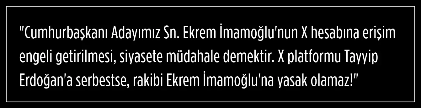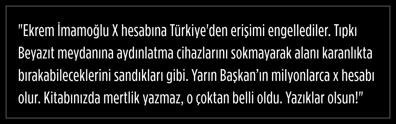 İBB'ye (İstanbul Büyükşehir Belediyesi) yönelik yürütülen operasyonun ardından tutuklanan ve görevinden uzaklaştırılan Ekrem İmamoğlu'nun sosyal medya hesabına erişim engellendi. Alınan mahkeme kararı doğrultusunda X platformundaki kişisel hesabının Türkiye'de erişime kapatılması yönünde işlem yapıldı.
