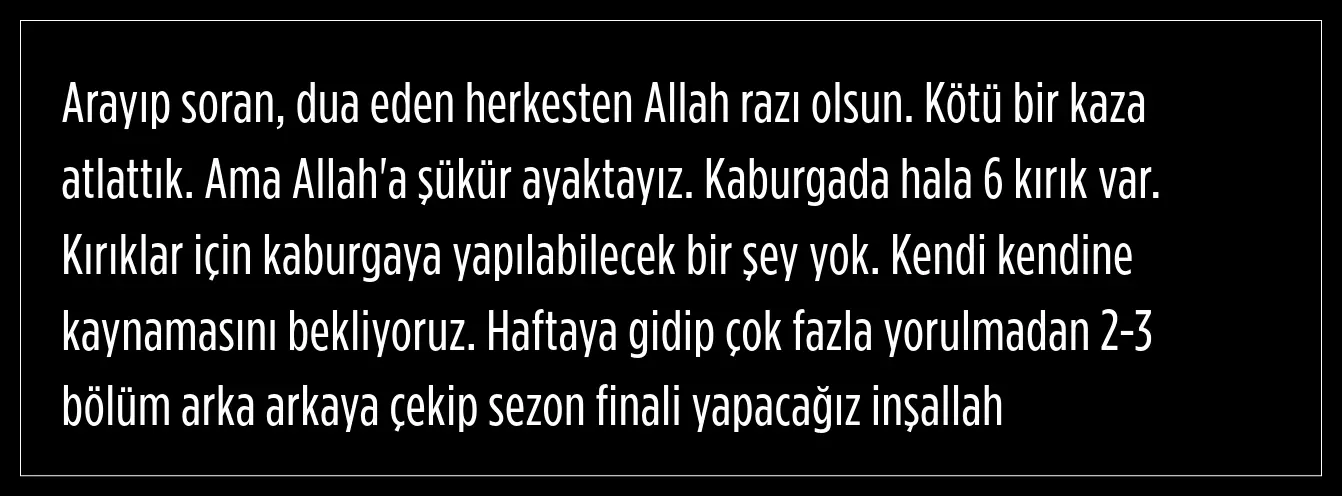 Berk Atan, geçirdiği kazanın ardından kendisini arayanlara ve dua edenlere seslenerek, "Herkesten Allah razı olsun" ifadelerini kullandı.