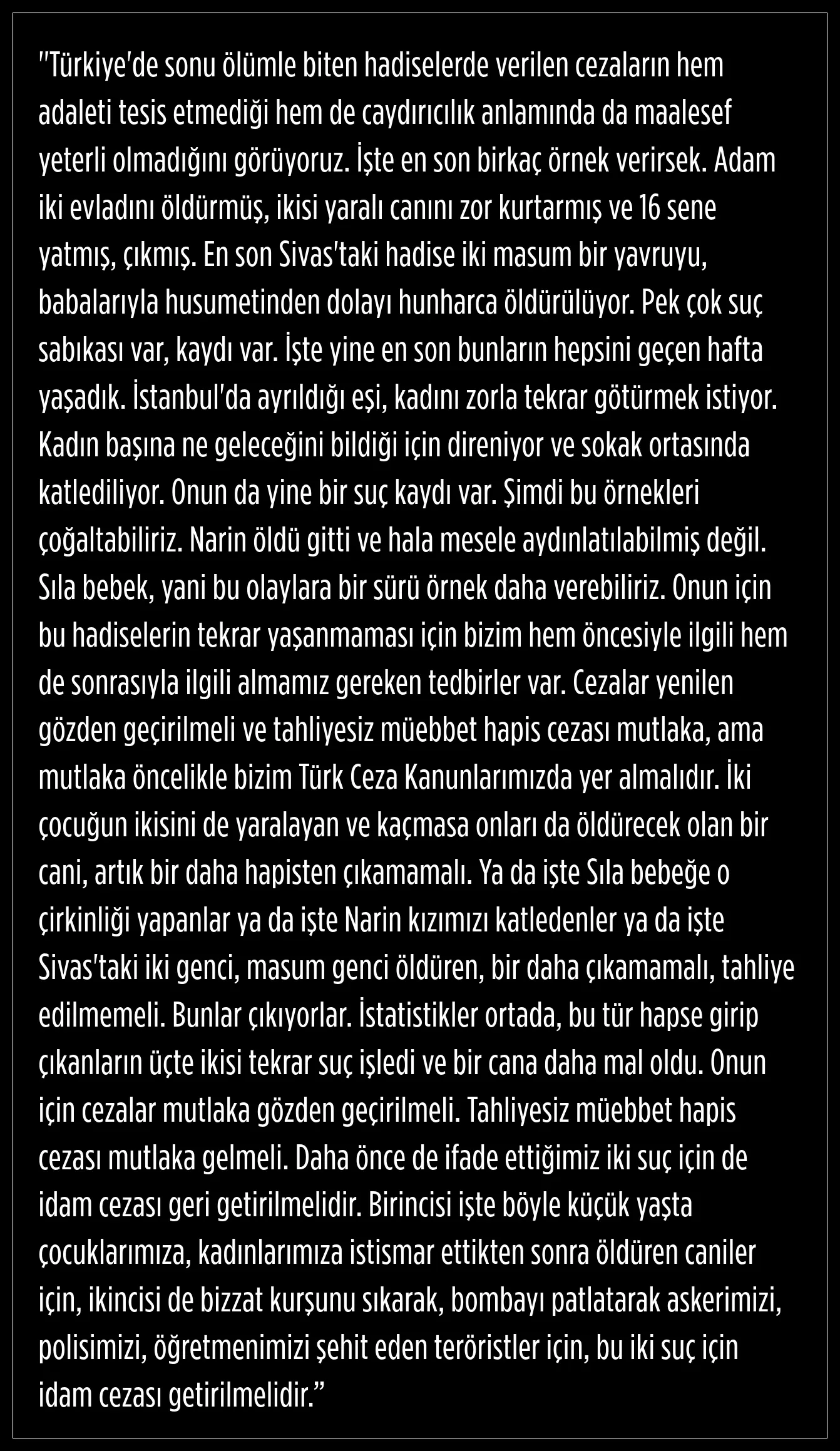 İdam talebini iki özel suç kategorisiyle sınırlandıran Büyük Birlik lideri, "Birincisi; çocuk ve kadınlara yönelik istismar sonrası işlenen cinayetler. İkincisi; asker, polis ve öğretmenleri hedef alan terör eylemleri. Bu iki suç için idam şart" açıklamasını yaptı.