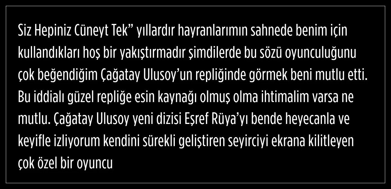 Tek, "Siz Hepiniz Cüneyt Tek” ifadesinin yıllardır hayranlarının sahnede kendisi için kullandıkları bir yakıştırma olduğunu ifade ederek, bu sözü Çağatay Ulusoy’un repliğinde görmenin kendisini mutlu ettiğini söyledi.