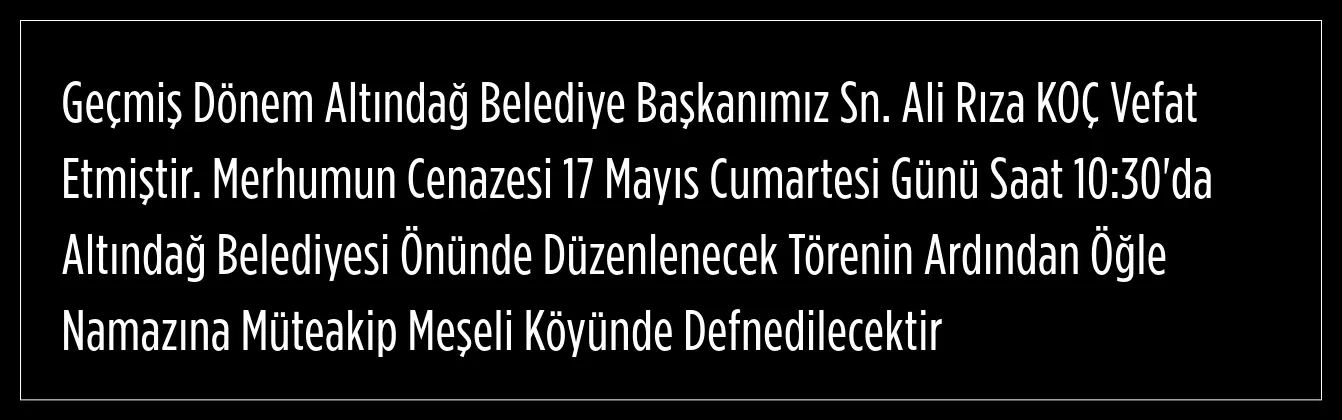 Koç'un acı haberini, CHP İlçe Başkanlığı duyurdu. Başkanlığın sosyal medya hesabından yapılan açıklamada, Geçmiş Dönem Altındağ Belediye Başkanı Ali Rıza Koç'un vefat ettiği bildirildi.