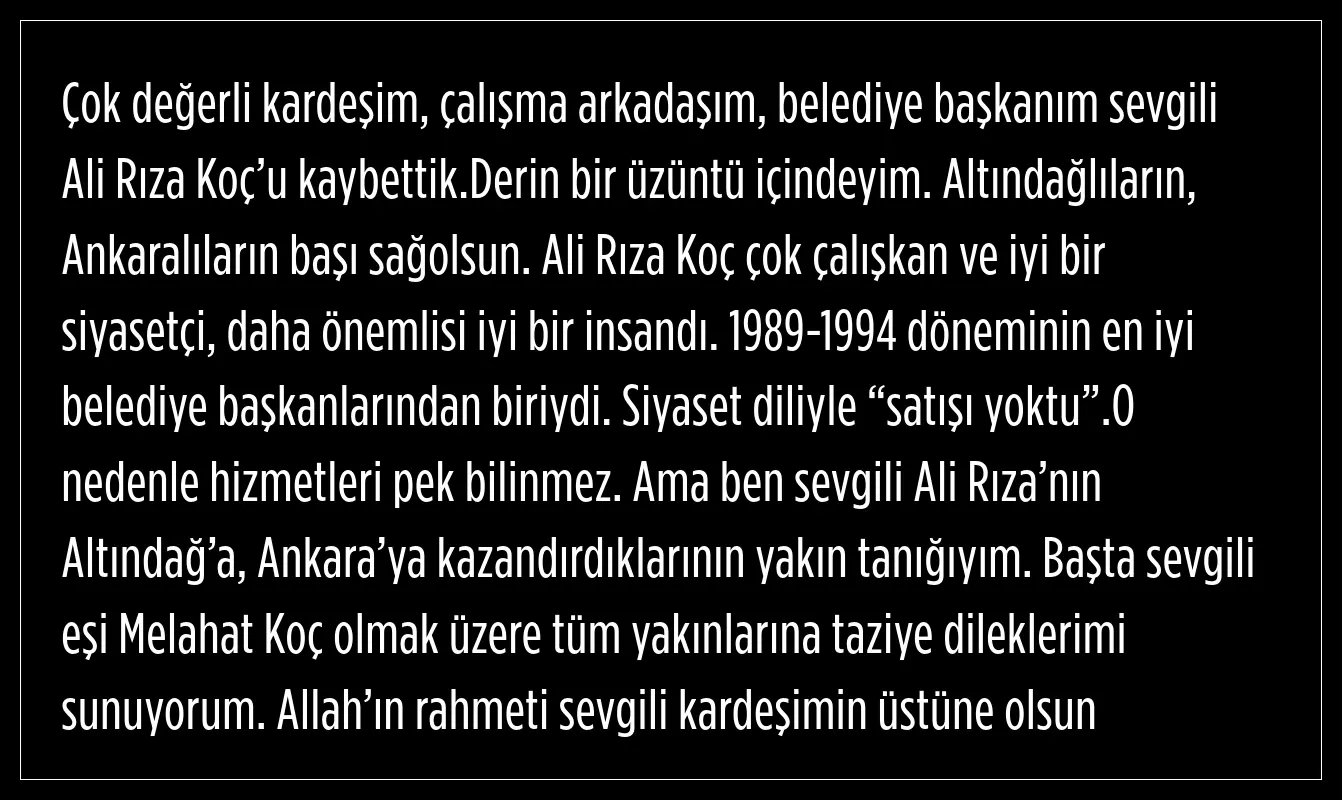 1989-1994 yılları arasında Ankara'nın Altındağ ilçesinde Belediye Başkanlığı görevini yapan Ali Rıza Koç'tan acı haber geldi.