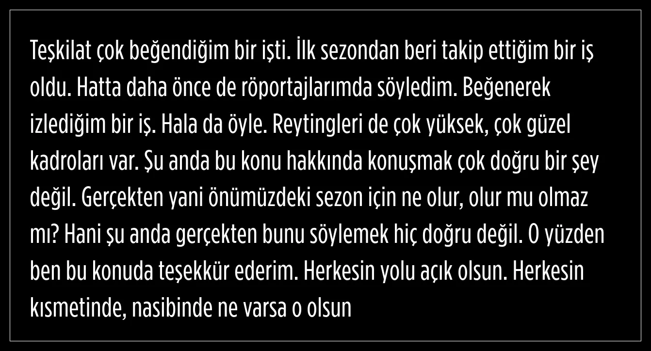 Teşkilat'ın çok beğendiği bir iş olduğunu ifade eden güzel oyuncu, ilk sezondan beri beğenerek izlediğini söyledi.