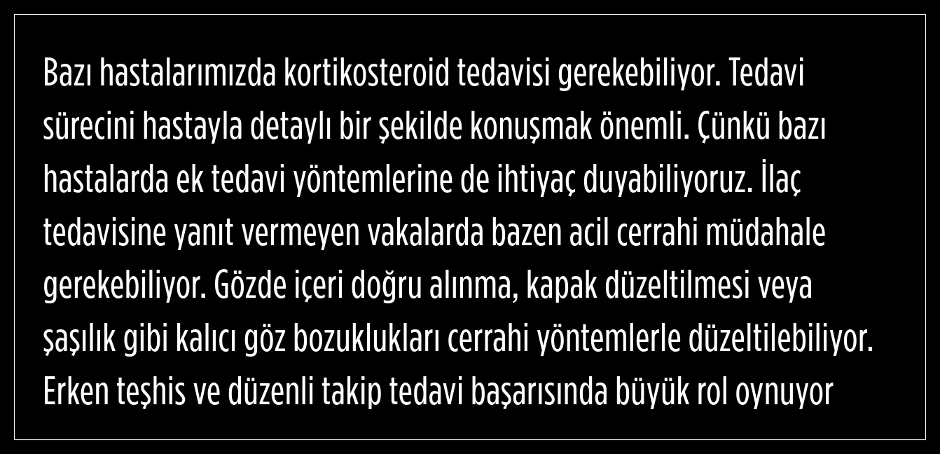 Tiroid rahatsızlığı bulunan kişilerin göz sağlığı açısından düzenli olarak kontrol yaptırmalarının önemine işaret eden Prof. Dr. Serin, gözle ilgili herhangi bir belirti fark eden hastaların vakit kaybetmeden bir göz hastalıkları uzmanına başvurmaları gerektiğini ifade etti.